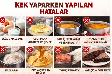 Kek Yaparken Yapılan Hatalar Malzemelerin Soğuk Olması Buzdolabından çıkan yumurta, süt, yoğurt Kek kabarmaz, doku sert olur Çözüm: Malzemeler oda sıcaklığında olmalı. Yumurtayı ve Şekeri Yeterince Çırpmamak Kısa ve özensiz çırpma Kek sönük ve ağır olur Çözüm: Yumurta + şeker rengi açılıp köpürene kadar çırpılmalı.