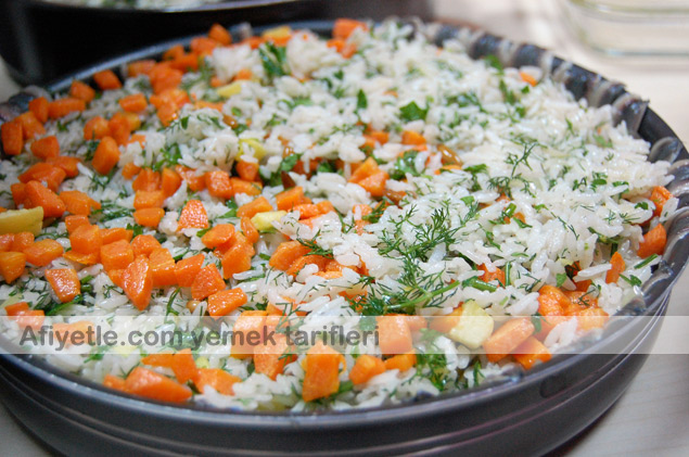 Pirinç ılık suda bekletilir. Patlıcan alacalı soyularak doğranıp tuzlu suda bekletilir. Daha sonra patlıcanlar yağ içinde kızartılır.Üzerine 3 bar...