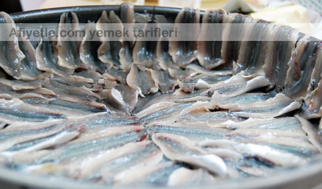 Tepsinizi yağladıktan sonra ayıklayıp yıkadığınız hamsileri düzgün bir şekilde dizin. İnce doğranmış soğanı yıkanmış pirince ilave edin. Maydanoz, bah...